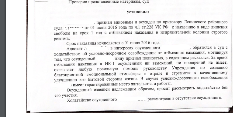 Отмечу, что первоначально осужденный самостоятельно обратился в суд с ходатайством об условно-досрочном освобождении. В указанном ходатайстве суд отказал.
